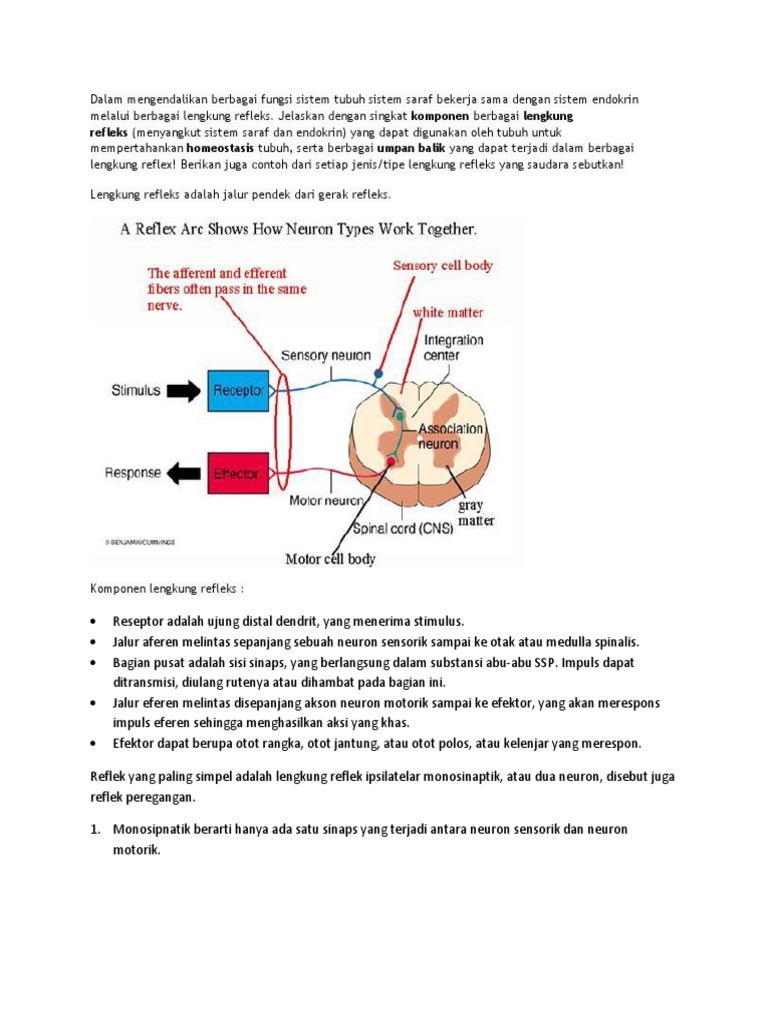 Makalah Lengkung Refleks / Case 6 Makalah Pdf : From lh5.googleusercontent.com scopri ricette, idee per la casa, consigli di stile e altre idee da provare.. Suatu reseptor, yang peka terhadap suatu macam rangsangan. Mungkin anda pernah mendengar kata gerak refleks? Ini terdiri dari alat indra, serat saraf aferen, satu atau lebih. Sebagian besar proses tubuh involunter (misalnya, denyut jantung, pernapasan, aktivitas pencernaan, dan pengaturan suhu) dan respons somatis (misalnya, sentakan akibat suatu stimulus nyeri atau sentakan pada lutut) merupakan kerja refleks. Neuron konektor merupakan penghubaung antara neuron sensorik dan neuron motorik.